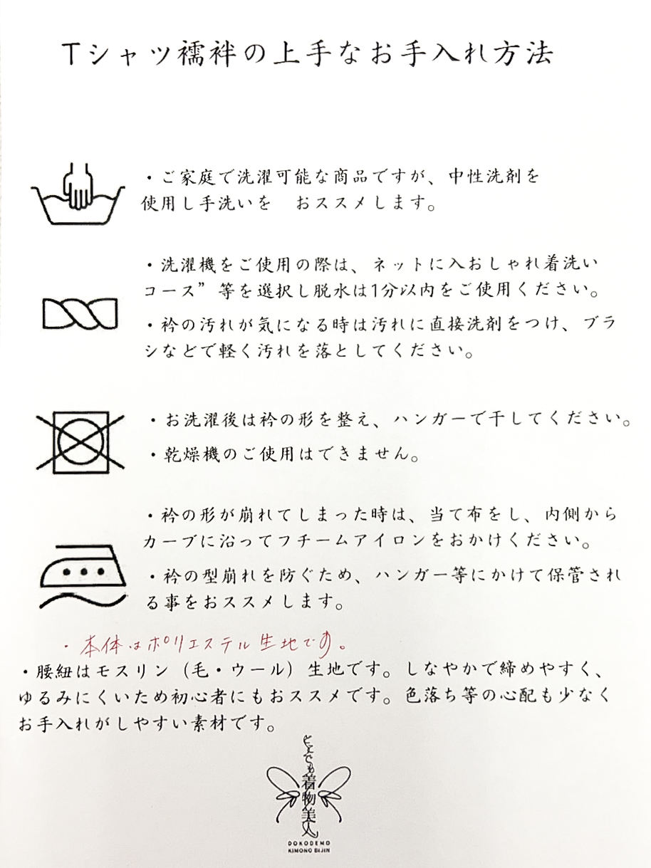 衿が少し硬めのため、着付けが綺麗に決まります。吸水性、速乾性に優れています。胸元部分はマジックテープで調整可能です。ご自宅で洗濯頂けます。洗濯機洗いを行う時はネットに入れてから洗濯してください。